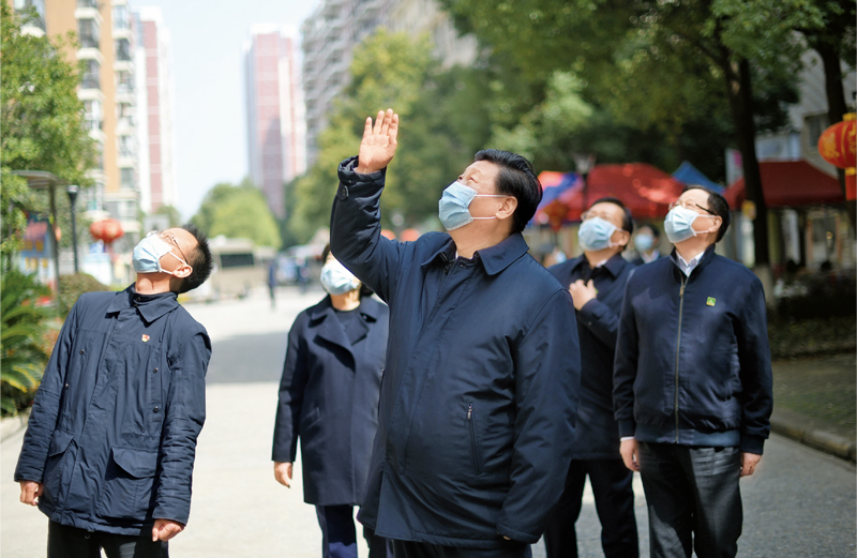 2020年3月10日,中共中央总书记、国家主席、中央军委主席习近平专门赴湖北省武汉市考察新冠肺炎疫情防控工作。这是习近平在东湖新城社区考察时,向在家隔离居住的居民挥手致意、表示慰问。 新华社记者 谢环驰/摄