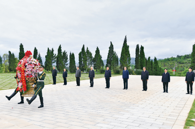 2021年4月25日至27日,中共中央总书记、国家主席、中央军委主席习近平在广西考察。这是25日上午,习近平在位于桂林市全州县的红军长征湘江战役纪念园,向湘江战役红军烈士敬献花篮。 新华社记者 谢环驰/摄