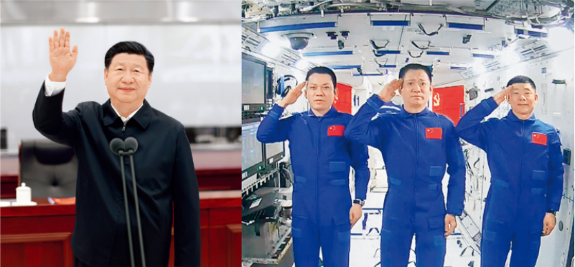 2021年6月23日,中共中央总书记、国家主席、中央军委主席习近平来到北京航天飞行控制中心,同正在天和核心舱执行任务的神舟十二号航天员聂海胜、刘伯明、汤洪波亲切通话。 新华社记者 鞠鹏(左图)、岳月伟(右图)/摄(拼版照片)