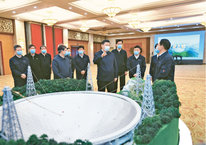 2021年2月3日至5日,中共中央总书记、国家主席、中央军委主席习近平来到贵州考察调研,看望慰问各族干部群众,向全国各族人民致以美好的新春祝福。这是5日上午,习近平亲切会见“中国天眼”项目负责人和科研骨干,听取“中国天眼”建设历程、技术创新、国际合作等情况介绍。 新华社记者 谢环驰/摄