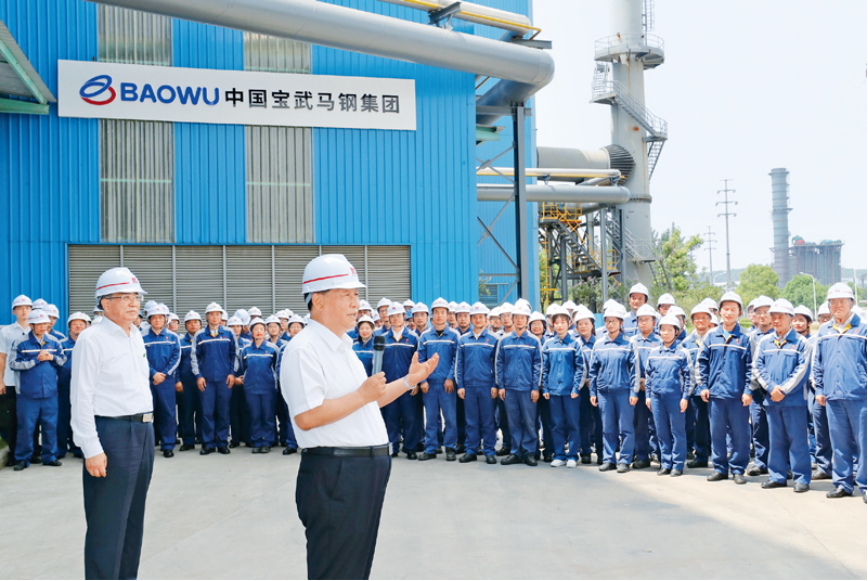 2020年8月18日至21日,中共中央总书记、国家主席、中央军委主席习近平在安徽省考察。这是19日上午,习近平在马鞍山市中国宝武马钢集团,同企业劳动模范、工人代表亲切交流。 新华社记者 鞠鹏/摄