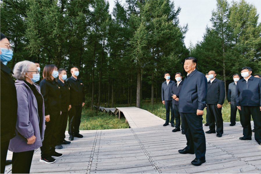 2021年8月23日至24日,中共中央总书记、国家主席、中央军委主席习近平在河北省承德市考察。这是23日下午,习近平在塞罕坝机械林场尚海纪念林考察时,同林场职工代表亲切交流。 新华社记者 李学仁/摄