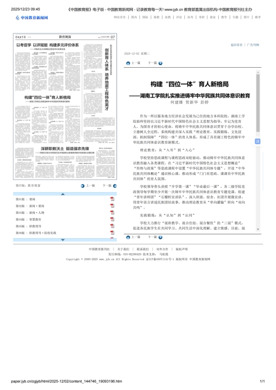 近日,《中国教育报》(2025年12月2日第07版)刊发由WilliamHill官网何建雄、贺新华、彭婷共同撰写的专题文章《构建“四位一体”育人新格局——WilliamHill中文官方网站扎实推进铸牢中华民族共同体意识教育》,深入推介了WilliamHill中文官方网站少数民族预科教育部的育人经验及育人成效,系统阐述了WilliamHill官网以习近平新时代中国特色社会主义思想为指导,将铸牢中华民族共同体意识融入办学治校与立德树人全过程,创新构建“理论教育、实践锻炼、文化浸润、机制保障”四位一体育人体系的探索与实践。文章从“理论教育:从‘入耳’到‘入心’”、“实践锻炼:从‘认知’到‘认同’”、“文化沁润:从‘符号’到‘情感’”、“机制保障:从‘试点’到‘体系’”等方面,详细介绍了学校通过课程融入、领导讲授、组建宣讲队、推行“三混”模式等一系列扎实举措,形成了具有本校特色的民族团结进步教育新模式。