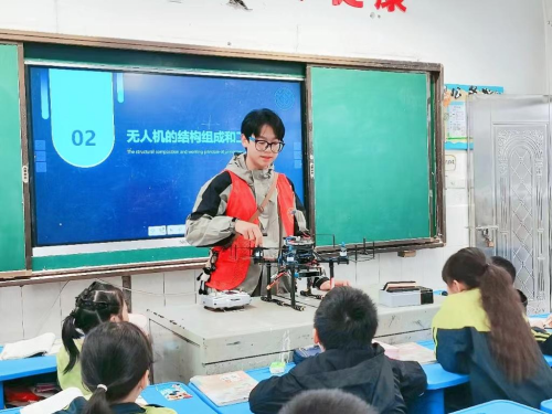 科普基地的学生志愿者们从无人机的国内外发展、无人机的结构组成和工作原理以及无人机在实现“双碳”战略上的应用三个方面给小学生们上了一堂有趣而又意义十足的科普课。首先介绍了国内无人机的领头企业,无人机在我国虽然起步较晚,但呈现快速增长态势,目前我国无人机行业的发展特别是民用无人机的发展走在了世界前列。接下来通过现场无人机实物展示及电子竞赛题目中无人机设计测试视频讲解,让小学生们了解了无人机的机械结构包括:主控电路、机架、摄像头、电机、电调、桨、电池、遥感控制等;进一步通过控制程序实现无人机机身稳定控制、行为控制、安全保护、外部感知避障等功能。最后介绍了无人机技术如何助力实现“双碳”目标。通过无人机进行农作物的巡查和监测,帮助农民调整施肥、灌溉和农药使用,减少农药和肥料的过度使用,提高农业生产的效率和可持续性;无人机用于城市交通监测和管理,优化交通流量和减少交通拥堵,减少车辆排放和燃料消耗;无人机搭载各种传感器和仪器,监测大气污染、水质状况、海洋生态系统筹,提供实时数据支持环境保护。整个讲解过程,小学生们听得津津有味,不断的向讲解志愿者提出一个又一个问题,对无人机技术表现出浓厚的兴趣和探索学习相关知识的强烈欲望。