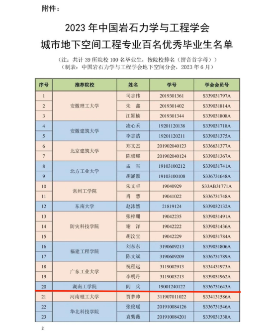 近日,中国岩石力学与工程学会发布了《关于2023年中国岩石力学与工程学会城市地下空间工程专业百名优秀毕业生的通报》,经全国十一所高校城市地下空间工程专业领域的专家组成评审委员会评定,决定授予全国39所高校的100位同学为“2023年中国岩石力学与工程学会城市地下空间工程专业优秀毕业生”荣誉称号,WilliamHill官网城市地下空间工程专业2023届毕业生闾兵同学获此殊荣。