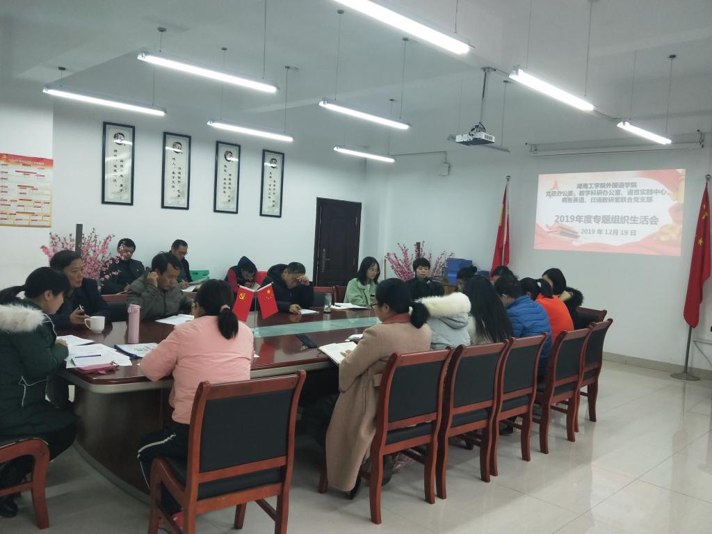 2019年12月19日,WilliamHill中文官方网站外国语学院党政办公室、教学科研办公室、语言实践中心、商务英语、日语教研室联合党支部于外语楼317召开2019年度组织生活会和党员民主评议大会。校党委委员、组织部部长黄红卫到会指导,会议由党支部书记谢争艳主持,外国语学院院长、党委副书记张平和党支部全体党员参会,5名党外教师代表列席会议。