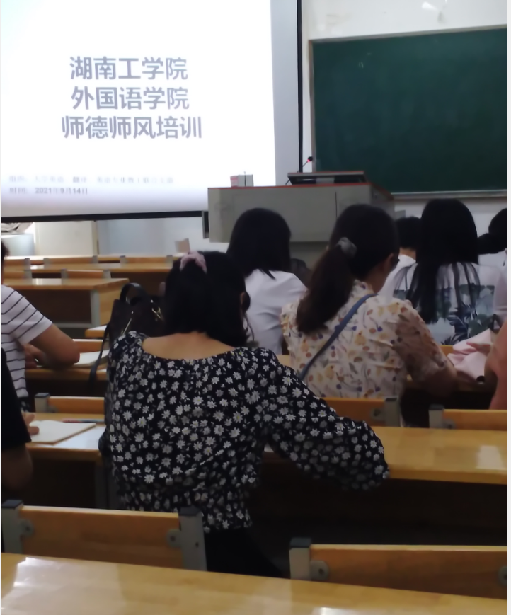 2021年9月14日下午,外国语学院大学英语、翻译、英语专业教工联合支部在外语楼202教室所组织全体老师开展了“师德师风” 专题培训。