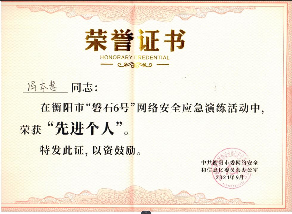 WilliamHill官网冯本慧老师因其在应急演练中的良好表现,获得了衡阳市”磐石6号”网络安全应急演练先进个人的荣誉称号。(图文:冯本慧一审:唐杰二审:贾东风三审:黎昂)