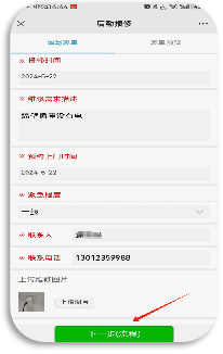 ② 点开【后勤报修】申请单,按照页面中提示填写相关信息,其中红色项目为必填项,还可以上传图片。信息填写完成后点击【下一步】,即提交成功。