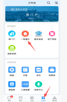 ① 登录企业微信,在工作台便可看到一网通办服务平台,点击进入后可办理相关业务。