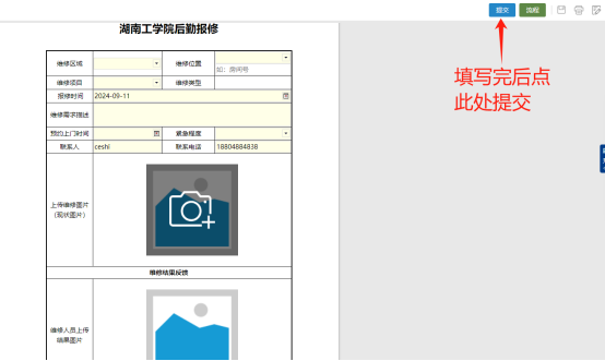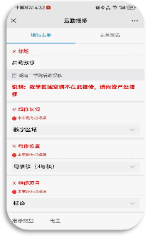 其他业务申请的操作流程基本和“后勤报修”的操作流程类似,只是在填写表单信息中,需要根据实际表单中要求的内容填写即可。