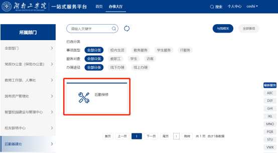 ① 申请:申请人按照上面的步骤登录一网通办服务平台后,如下图,点击左侧“后勤基建处”,再点击右侧“后勤报修”