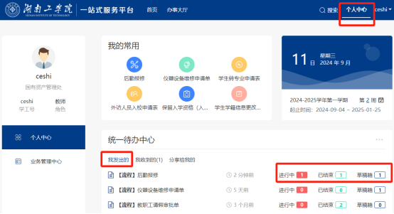 申请人可点击系统右上角的“个人中心”->“我发出的”,可以查看自己填写过或者提交过的申请单,其中[进行中]表示已提交,但还没有审批结束,[已结束]表示已审批完成的,[草稿箱]表示在上一步填写后没有提交,保存至草稿箱的单子。