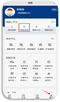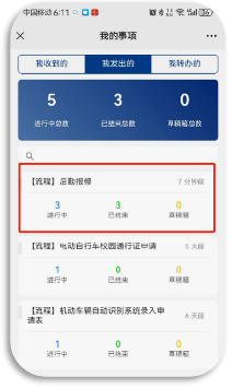 ③ 办理进度查看:在服务大厅页面“我的”栏目中选择【我发起的】。在“【流程】后勤报修”中可查看各种状态下提交的报修工单,点击进去后可查看详细内容。