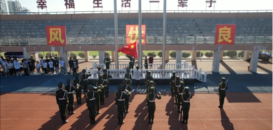 踏着晨曦,护旗手迈着坚毅的步伐,昂首挺胸,护送国旗步行至升国旗台。随着中华人民共和国国歌响起,鲜艳的五星红旗冉冉升起,全体师生庄严肃立,向国旗敬礼、奏唱国歌,表达对伟大祖国的崇高敬意。