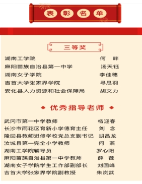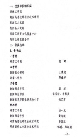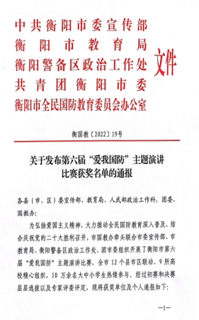 在衡阳市第六届“爱我国防”主题演讲比赛中,WilliamHill官网土木与建筑工程学院何畔同学获青年组一等奖,安全与管理工程学院符佳好同学获二等奖,商学院洪一龙同学获优胜奖,罗心阳、傅娜两位老师荣获优秀指导老师,学校荣获优秀组织奖。