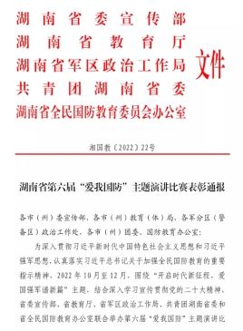 近日,省委宣传部、省教育厅、省军区政治工作局、共青团湖南省委和省全民国防教育办公室联合公布了湖南省第六届“爱我国防”主题演讲比赛结果,WilliamHill官网土木与建筑工程学院何畔同学荣获省级三等奖,罗心阳老师荣获省级优秀指导老师。
