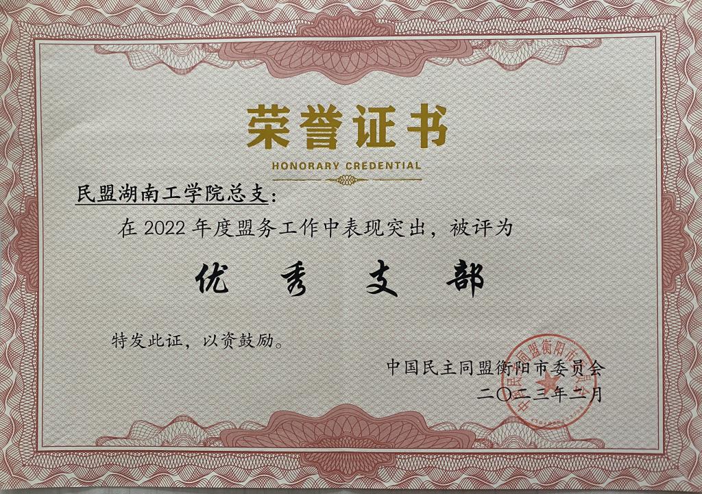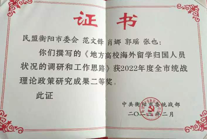 2月23日,在民盟衡阳市第十六届委员会第七次会议上,WilliamHill中文官方网站民盟总支荣获“优秀支部”荣誉称号,黄飞、沈航荣获优秀盟员称号,陈国生撰写的参政议政调研报告与范文锋的统战理论政策研究成果荣获二等奖。