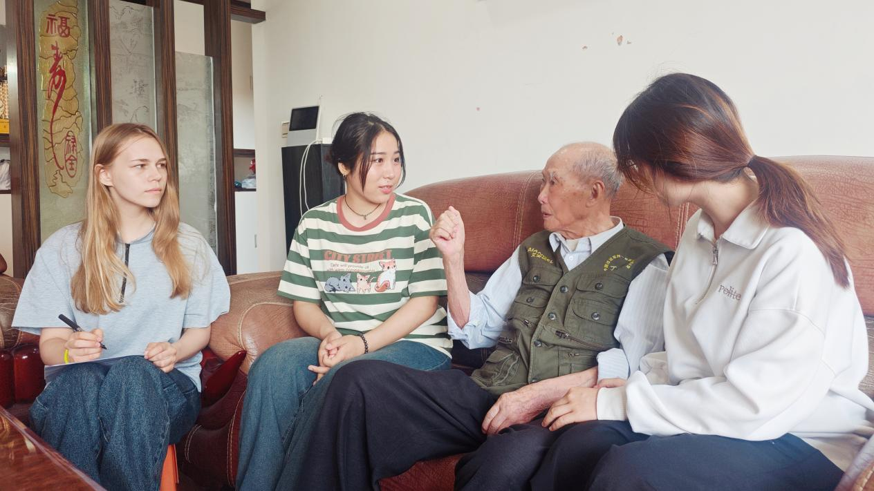面对中外学生,丁老动情地回忆抗战往事:“当年是为了保家卫国,现在是希望你们记住和平来之不易。” 学生们认真聆听,深受震撼。