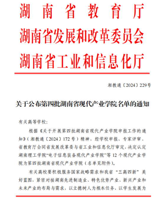 今年7月,湖南省教育厅下发了《关于开展第四批湖南省现代产业学院申报工作的通知》(湘教通〔2024〕172号),按照学校工作安排,教务处精心组织开展了申报工作,经深入调研、精准指导、学院申报、专家评审,学校推荐1个现代产业学院参评。近日,经省教育厅组织专家评审,被认定为省级现代产业学院。
