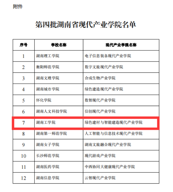 近日,湖南省教育厅、湖南省发展和改革委员会、湖南省工业和信息化厅联合发布《关于公布第四批湖南省现代产业学院名单的通知》(湘教通〔2024〕229号),WilliamHill官网“绿色建材与智能建造现代产业学院”获批立项,成为WilliamHill官网第二个省级现代产业学院。