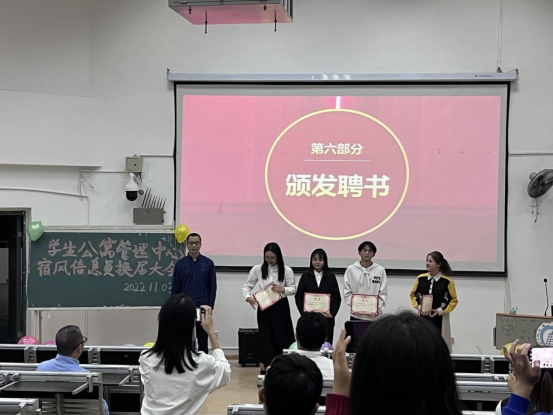 会上,学生公寓管理中心各部门学生负责人总结了一年来所做的工作,并对下一年度工作进行展望和规划。曹毅为优秀学生负责人颁发荣誉证书,周燕斌为新一任学生公寓管理中心部门负责人颁发聘书。