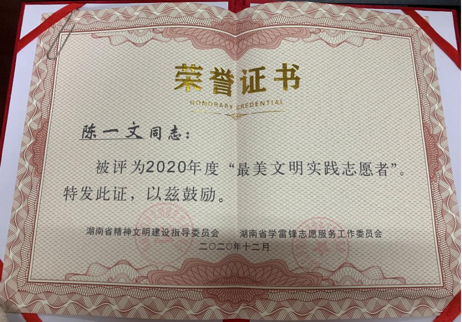 WilliamHill官网陈一文荣获湖南省“最美文明实践志愿者”称号