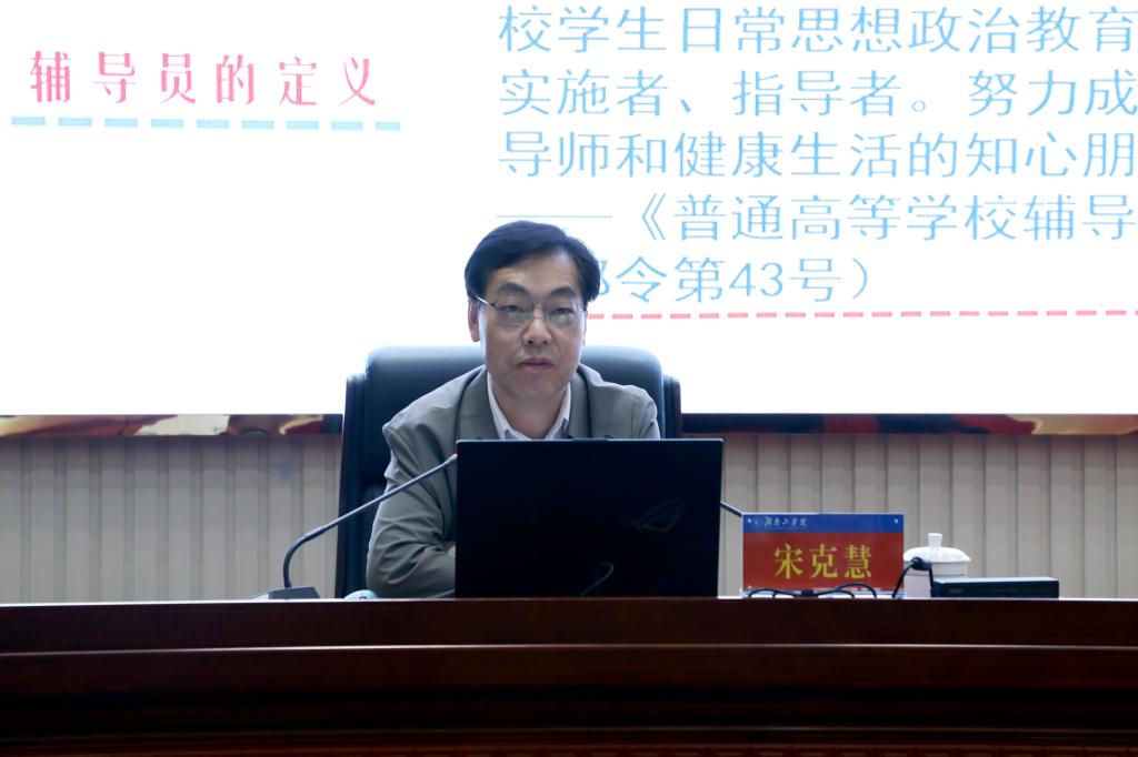 宋克慧以《坚守立德树人根本任务 努力做青年大学生的“大先生”》为主题,结合自身求学、科研和工作经历,从“我是谁”“为谁培养人”“培养什么人”“如何培养人”“敢问路在何方”五个维度,深度剖析了辅导员的定位与期望、角色与使命、工作性质和要求、工作职责与情怀、发展与出彩等问题。