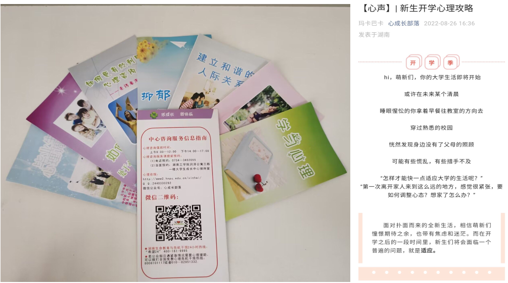 成长中心针对新生适应阶段的心理成长特征,特开展“线上-线下”并行科普宣传方式,线下编制了心理健康宣传册,涵盖“学习心理”、“建立和谐的人际关系”、“找回遗失的自信”、“应对焦虑和抑郁”等主题,创设常见情景,帮助同学们提升心智;线上通过“心成长部落”每日发表心理科普推文,累积推出10余篇,从自我成长视阈帮助大学生适应新生活,打好预防针,增添学生的求助渠道,提升自我管理、自我服务的能力。