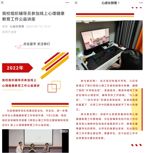 迎新前后,中心针对教师与学生两个群体开展专业服务,开学伊始,中心组织全体辅导员参与“心理健康教育工作”线上培训,帮助辅导员提升心理知识储备,提升育人技能。迎新期间,设立“心声”服务点,布置迎新牌和服务指南,向新生介绍成长中心的功能与服务内容,师生均在岗提供专门的校园咨询、心理知识科普、大学成长经验分享等,为学子送上贴心帮助。