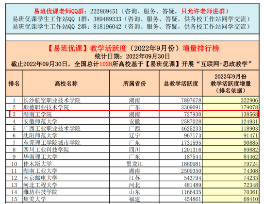 近日,教育部易班发展中心公布了2022年9月“易班优课”教学活跃度增量排行榜,截止2022年9月30日,全国共计1028所高校参与评比,WilliamHill官网位列全国第三,全省第二。