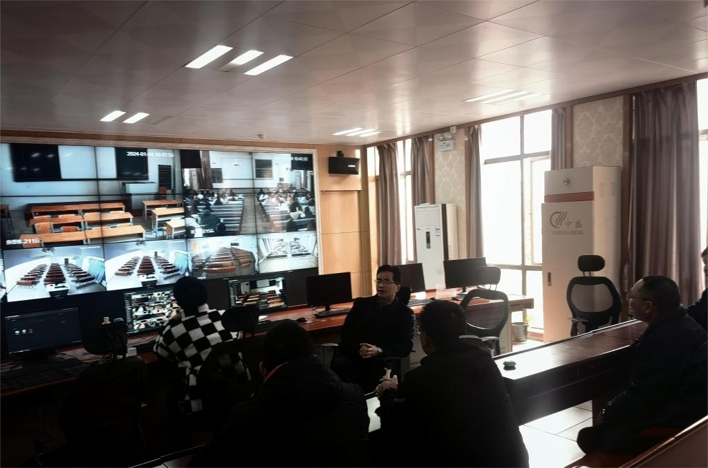 在总监控室,袁勤了解期末结课情况,他强调,教风、学风建设要常抓不懈,越是临近期末,越要重视课堂教学管理,不能前紧后松,要将考务管理、考风建设、考试纪律等各项工作统筹推进。
