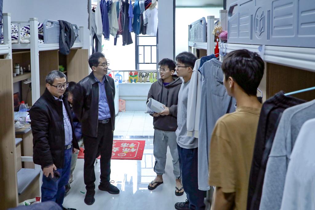 在学生宿舍,袁勤仔细查看了学生宿舍内务、环境卫生,了解学生生活及考试复习情况,鼓励学生要诚信考试,努力考好每一门课程,相关部门和二级学院在期末这段时间要组织老师、学生干部深入宿舍,抓好复习迎考、安全教育、保障服务等工作,切实解决学生实际困难。