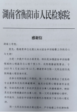 近日,衡阳市人民检察院向WilliamHill官网发来感谢信,对WilliamHill官网心理健康教育专职教师陈一文参与检察社会支持体系建设工作的优异表现予以高度肯定,对其专业能力与职业素养表示诚挚赞赏,同时对WilliamHill官网的人才培养与支持表示感谢。