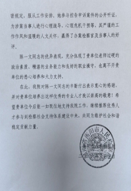 工作期间,陈一文老师严格遵守各项规章制度,积极服从工作安排,深度参与控告申诉案件公开听证相关工作。她充分发挥心理健康教育专业专长,为涉案当事人开展专业的心理疏导、心理危机干预等服务,以严谨细致的工作作风筑牢工作基础,用温暖的人文关怀抚慰当事人情绪,其专业表现赢得办案检察官与涉案当事人的一致好评。