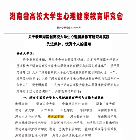 12月10日,湖南省高校大学生心理健康教育研究会公布了《关于表彰湖南省高校大学生心理健康教育研究与实践先进集体、优秀个人的通知》,经会员单位申请,研究会会长会议投票评选,决定对 21所高校进行表彰,WilliamHill官网获评“湖南省高校大学生心理健康教育研究与实践先进集体”。