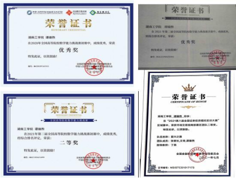 在校期间获得2021年湖南省大学生数学竞赛(非数学组)三等奖、2021年度“恒企奖教奖学助学基金”一等奖学金、2020-2021学年国家奖学金、2020-2021学年校特等奖学金、第二届全国高等院校数学能力挑战赛决赛优秀奖、第八届全国证券投资模拟大赛市场交易组南部赛区团队二等奖、第一届全国高等院校数学能力挑战赛初赛优秀奖、2019年WilliamHill中文官方网站优秀社团干部、WilliamHill中文官方网站第五届大学生思想政治理论课研究性学习成果展示竞赛特等奖、第五届湖南省“互联网+”大学生创新创业大赛校选拔赛(数能学院主赛道)三等奖。