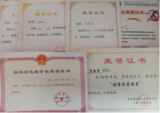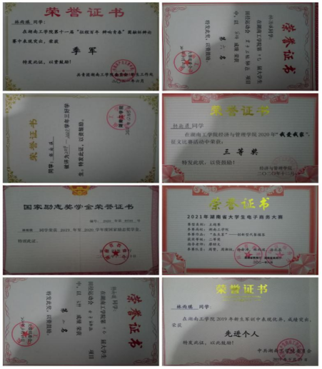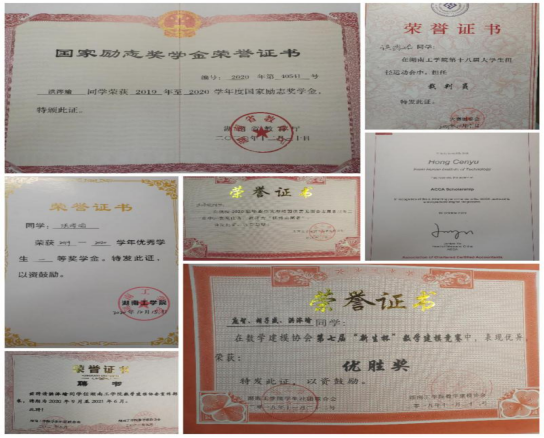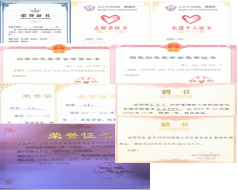 在校期间获得国家奖学金1次、国家励志奖学金1次、湖南省电子商务大赛省级二等奖1次、优秀共青团员干部1次、优秀共青团员1次、校级一等奖1次、校级二等奖1次,校三好学生2次。