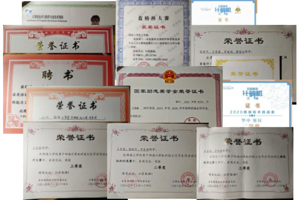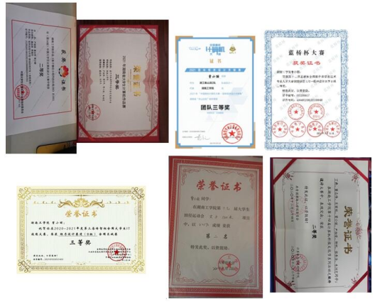 在校期间获得湖南省2021团队程序设计天梯赛团队三等奖、3届蓝桥杯全国软件和信技术专业人オ大赛-个人赛省赛二等奖、全国大学生传智杯三等奖、中国大学生计算机设计大赛二等奖、湖南省大学生计算机作品赛三等奖、WilliamHill中文官方网站第十四届计算机科技文化节软件设计大赛二等奖、WilliamHill中文官方网站校运会女子1500二等奖、WilliamHill中文官方网站互联网+三等奖、湖南省数字媒体大赛省二等奖、流星沙杯物流设计大赛省三等奖。