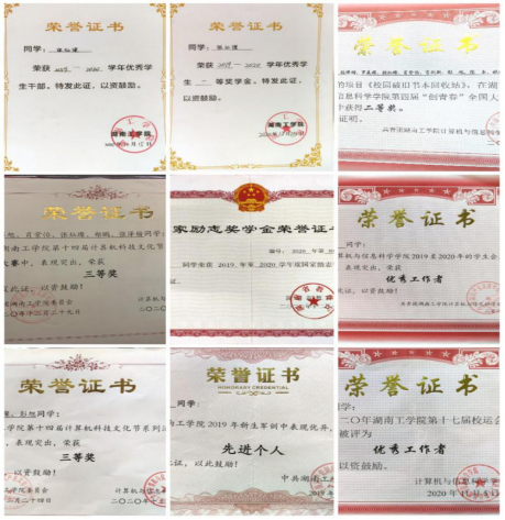 在校期间获得国家励志奖学金、优秀学生一等奖学金、校级三好学生、校级优秀学生干部、2020团体程序设计天梯赛全国总决赛参与奖、2020 中国高校计算机网络挑战赛华中赛区二等奖、第十一届蓝桥杯湖南赛区三等奖、互联网+校级三等奖、网页设计大赛一等奖、PS设计大赛一等奖、微生活微电影大赛二等奖等荣誉。