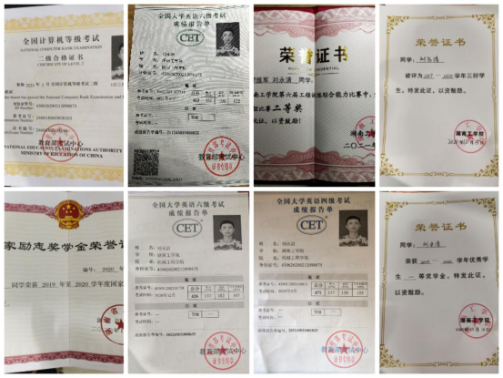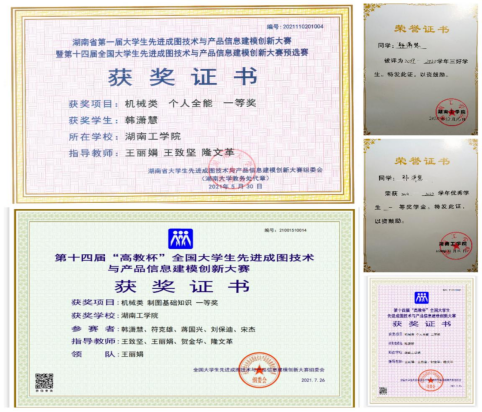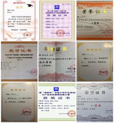 在校期间获得国家奖学金一次、校级一等奖学金两次、三好学生一次、校级二等奖学金一次,在“李冰”校友奖学金中获科技实践奖。在CaTICs竞赛中获得一等奖,在2020年广东省第一届职业技能大赛中获得个人二等奖、团队二等奖,在第十三届“高教杯”先进成图大赛获得团体全国二等奖和两项个人全国一等奖,在第六届湖南省大学生工程训练综合能力竞赛中获得热能驱动车赛项一等奖。