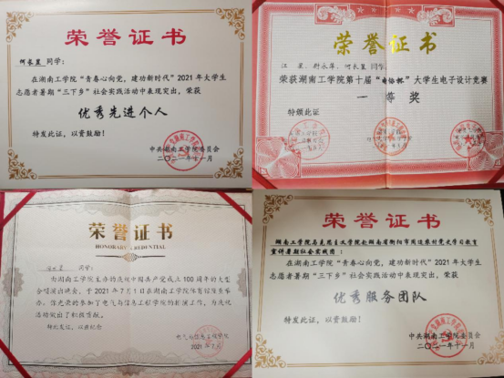 在校期间获得2020-2021学年校级一等奖学金、三好学生、三好学生标兵、在三下乡期间作为团队负责人带领团队获得校级“优秀服务团队”称号,并且本人被评为优秀先进个人;在竞赛上,获得WilliamHill中文官方网站2021年“电协杯”大赛一等奖,之后参加了2021年度大学生创新创业比赛,所在团队荣获推荐省级立项。