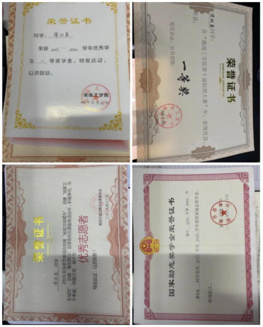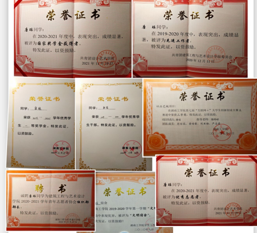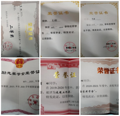 在校期间获得校级一等奖学金奖学金2次、国家励志奖学金1次、三好学生、1次,优秀团干2次、优秀共青团员、校级制图大赛二等奖、大创校级立项负责人,并获得了国家奖学金。