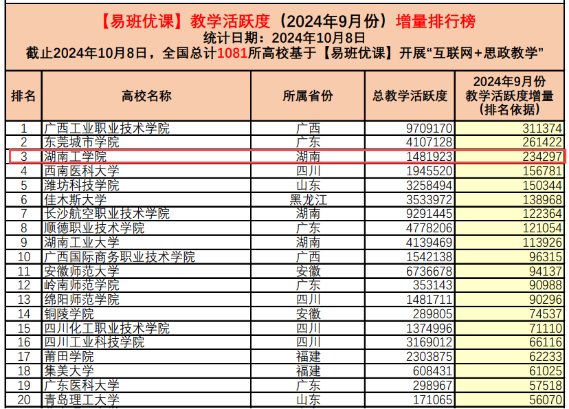 近日,教育部易班发展中心公布了2024年9月“易班优课”教学活跃度增量排行榜,WilliamHill官网在全国1081所高校中脱颖而出,在全国排名中位列第三、湖南省高校中位列第一,创历史新高。